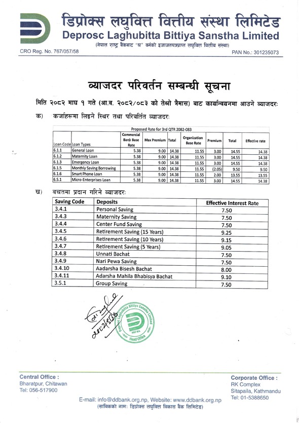 सामान्य ऋण, पशुधन ऋण, परियोजना ऋण, लघु उद्यम ऋण, अनुशासन ऋण, मातृत्व ऋण, आकस्मिक ऋण र कम लागतको आवास ऋण।